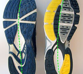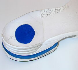 Eine exzessive Fußeversion und/oder Tibiarotationskräfte werden Zusammenhang mit einem Anstieg von Überlastungssyndromen im Bereich des Knies, wie z.B. dem Patellafemoralenschmerzsyndrom oder dem Traktus iliotibialis Syndrom gebracht 222324. Aber auch über ein gehäuftes Auftreten von Shin splins, Achillodynien, plantarer Fasciitis und Stressfrakturen wird in der Literatur berichtet 11252627. Konsequenterweise wurde daher eine regelhafte Ausrichtung des Skeletts als eine wesentliche Aufgabe von Laufschuhen und Einlagen gesehen. Die Unterstützung des medialen Längsgewölbes wird häufig als wichtigste Maßnahmen zur Korrektur einer Überpronation dargestellt, wobei der Effekt auf die Fuß- und Beinbewegung oft nur klein und nicht konsistent war 2829303132. Auch die Integration von härteren Komponenten medialseitig (sog. „Second Density“), welche der Pronationsbewegung einen höheren mechanischen Widerstand entgegen setzen sollte, war nicht geeignet die Pronationsbewegung grundlegend zu beeinflussen 333435 (Abbildung 5). Gleiches gilt für die Tibiarotation die durch eine medialer Abstützung ebenfalls nicht systematisch beeinflusst wird 3637.