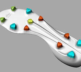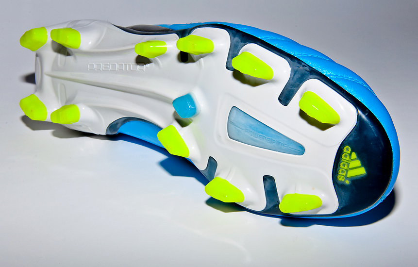 Basierend auf Vorteilen der runden Stollen, die bei den Spielern eine hohe Akzeptanz besitzen und eine gleichmäßige Stollendruckverteilung ermöglichen und den Vorteilen der länglichen Stollen, wurde eine neue Generation von Stollen entwickelt, die die jeweiligen Vorteile vereinen sowie zusätzlich noch bessere Beschleunigungseigenschaften bieten. Die seitlichen flachen Stollenwände wurden beibehalten, in Richtung der Sohle wurden große Radien eingezogen, um ähnlich der runden Stollen eine gleichmäßigere Druckverteilung zu bieten. Zudem wurde die Größe und Ausrichtung entsprechend der positionsbezogenen Funktion angepasst (Abb. 3).