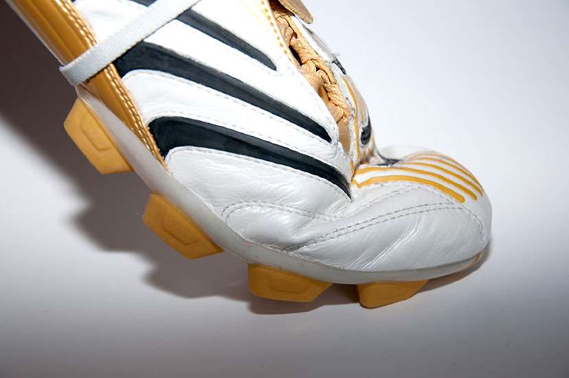 Vor einigen Jahren war die Einlage von Gewichten in die Zwischensohle zur Veränderung des Schwerpunkts populär. Durch die Positionierung eines zusätzlichen Gewichts (ca. 40 g) in der Einlegesohle unter dem Mittelfuß, wurde der Schwerpunkt des Schuhs unter den Schusspunkt am Fuß verschoben. Die Hersteller postulierten eine um bis zu 5% höhere Schusskraft. Die Realität hat aber gezeigt, dass der Nachteil des höheren Gewichts entscheidender ist, als der Vorteil der geringfügig höheren Schusskraft. Verliert ein Spieler den Sprint im Kampf um Ball ist die Frage nach der Schusskraft nicht mehr relevant. Zwischenzeitlich sind die Gewichte wieder verschwunden und durch Sohlenkonstruktionen ersetzt worden, die bei leichterem Gewicht die Anforderungen an Stabilität unter dem Mittelfuß und hoher Flexibilität beim Sprinten ermöglichen. Eine hohe Steifigkeit für einen kraftvollen Schuss ist dennoch vorhanden (Abb.8).