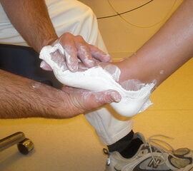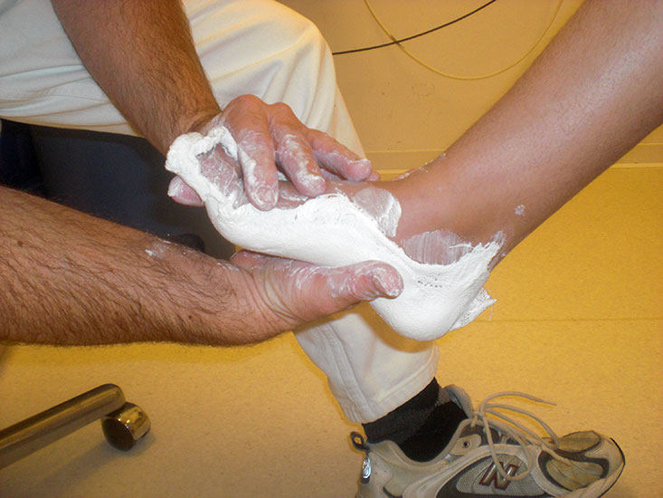 Als 3-dimensionale Abdruckverfahren kommen der Schaumabdruck, 3D Fußscans, sowie der Gipsabdruck zum Einsatz. Gerade letzterer hat trotz zunehmender Digitalisierung unverändert seine Berechtigung. Im Gegensatz zu einem 3D-Laserscan des Fußes kann bei der Abnahme eines Gipsabdrucks die korrigierende Formung bereits eingearbeitet werden. Der Techniker hält den Fuß in Händen und bekommt ein gutes Gefühl hinsichtlich der Redressierbarkeit von Fehlstellungen (Abb. 14). Unverändert kann mit vordergründig präziserer digitaler Technik diese Information nicht erfasst werden.