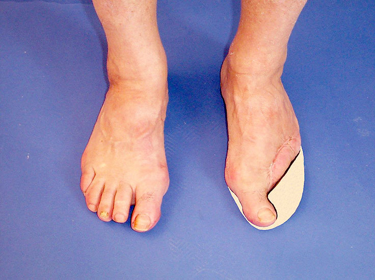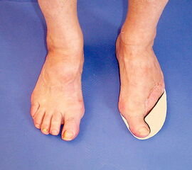 Die Alternative zu einer festen Einlage stellt eine Sohlenversteifung oder eine nahezu Sohlenversteifung dar in Kombination mit einer rückversetzten Ballenrolle wird der Vorfuß entlastet, das Abrollen erleichtert. Bei einer Amputation der II. Zehe resultiert häufig eine Hallux valgus Stellung durch ein Herüberwandern der I. Zehe in die Lücke. Hier ist prinzipiell amputationschirurgisch die Strahlresektion des II. Strahles vorzuziehen, da sich dann eine geringere Deformität entwickelt. In seltenen Fällen ist hier ein Silikon-Spacer zu nutzen, oder eine entsprechende Zehenprothese, um ein Herüberwandern der I. Zehe zu vermeiden. - Zehenprothesen