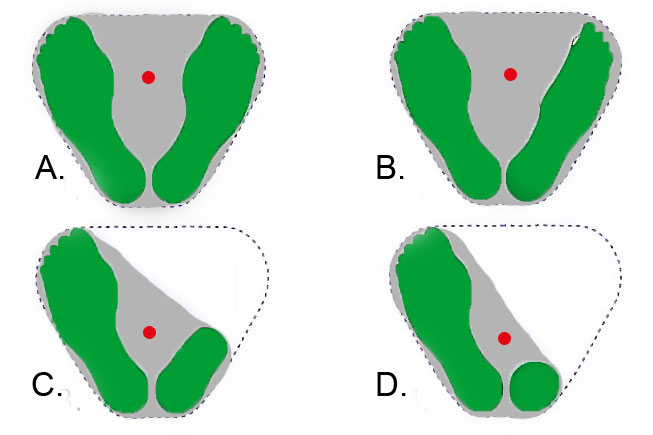Je ausgedehnter die Amputation, desto kleiner die Standfläche und desto größer der Druck auf das verbliebene Gewebe. Normale Standfläche ca. 140 cm² (A), nach Resektion des 1. Strahls 120 cm² (B), nach Lisfranc Amputation 80 cm² (C) und nach Pirogoff oder Syme Amputation 28 cm² (D). Je kleiner der Stumpf desto instabiler der Stand. Instabil ist der Stand immer dann, wenn das Lot (roter Punkt) außerhalb des grau hinterlegten Feldes liegt.