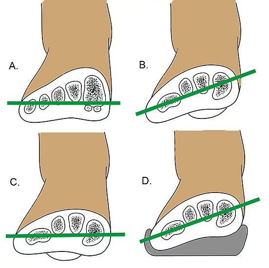 In Höhe der Zehengrundgelenke liegt der Vorfuß plan auf dem Boden auf (A), bei Amputationen im Bereich des Ristes entsteht eine distale Auflagefläche in Supination (B). Gleichzeitig stellt sich der Kalkaneus in einer Pronation ein. Die verbleibende Supination distal lässt sich orthopädietechnisch ausgleichen (Baumgartner 2008).
