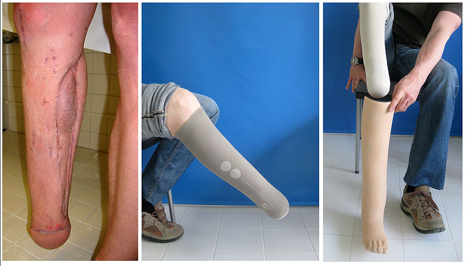Wichtig ist dabei eine Berücksichtigung der dreieckigen Gegenfläche des vorderen Schienbeinbereiches. Durch die Verkürzung der Beinlänge von 6 – 8 cm ist ohne weiteres eine kosmetisch ansprechende Versorgung mit entsprechenden Fußpassteilen möglich.