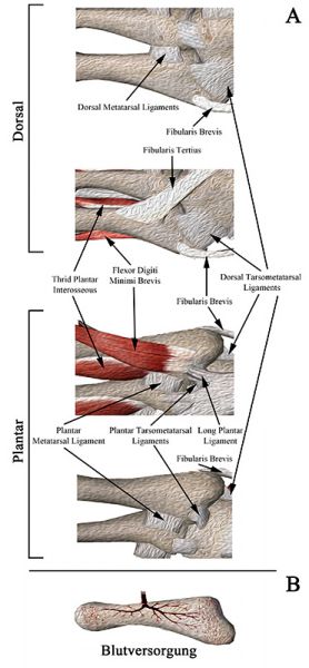 Auch die Blutversorgung variiert innerhalb des MT V (Abb. 2B). Die proximale Metaphyse wird von extraossär über ein Netz aus Perforansgefäßen (Seitenäste der A. tarsea lateralis) versorgt. Die Diaphyse wird intraossär von einer A. nutricia versorgt. Der metadiaphysäre Bereich (Lawrence und Botte Zone III) liegt zwischen diesen beiden Versorgungsgebieten und ist daher relativ weniger durchblutet. Eine eingeschränkte Blutversorgung hat wiederum einen negativen Einfluß auf die Frakturheilung 111213.