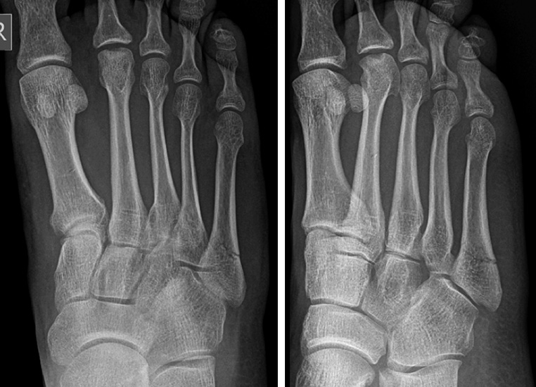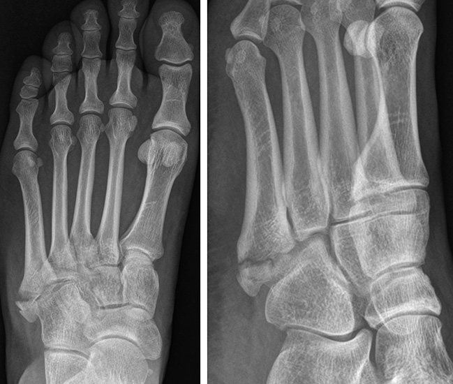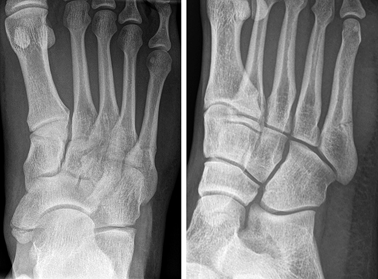Metatarsale V Basisfrakturen gehören zu den häufigsten Frakturen des Fußes. Der primäre Unfallmechanismus ist das einfache Umknicktrauma. Bei akuten Verletzungen ist das Röntgen des Fußes in 3 Ebenen die Diagnostik der Wahl. Nur in Ausnahmefällen ist ein MRT oder CT notwendig. Anhand der schrägen Fußaufnahme sollten akute Fraktur nach Lawrence und Botte (L+B] klassifiziert werden. Stressfrakturen treten überwiegend in Zone III auf und sollten zusätzlich nach Torg klassifiziert werden. Der Begriff Jones Fraktur ist irreführend, da er synonym für verschiedene Frakturlokalisationen verwendet wird. Differentialdiagnostisch können akzessorische Knochen, wie Z.n. das Os vesalianum oder das Os peroneum, als Frakturen fehlinterpretiert werden.