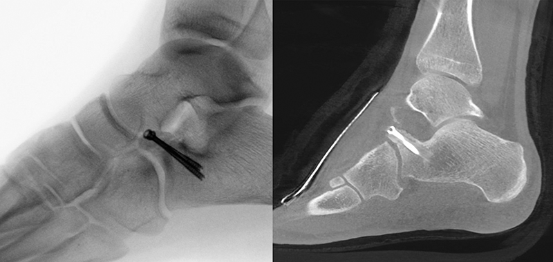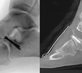 Bei entsprechendem Unfallmechanismus sollte differentialdiagnostisch immer an eine Fraktur des Processus anterior calcanei gedacht werden. Die Diagnosestellung kann heute mittels der hohen Verfügbarkeit schnittbildgebender Verfahren sicher und frühzeitig gelingen. Patienten mit akuter Fraktur und großem, disloziertem Fraktur-Fragment (Typ Degan III) können von der Durchführung einer Osteosynthese profitieren (Abb. 4). Aufgrund der guten Erfahrungen mit der früh-funktionellen Therapie mittels beschwerdeabhängiger Vollbelastung empfehlen die Autoren den Patienten die Operation im Rahmen der akuten Verletzung vor allem dann, wenn eine Instabilität im Chopart-Gelenk vorliegt. Zur Entscheidung werden Röntgenaufnahmen im seitlichen Strahlengang des Fußes unter Belastung angefertigt und auf eine Instabilität in der Chopart-Gelenklinie geachtet. Zusätzlich werden bei Verdacht auf eine Instabilität Stress-Aufnahmen des CC-Gelenkes durchgeführt. Fast alle Autoren führen eine Exzision der Fragmente nur dann durch, wenn sich die Beschwerden nicht bessern und es zur Ausbildung einer Pseudarthrose kommt.