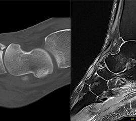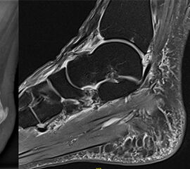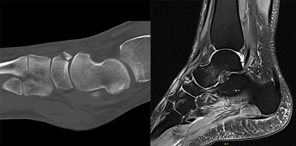 Häufig kommt es im Rahmen von PAC Frakturen zu knöchernen und/oder ligamentären Begleitverletzungen 20227. Eine aktuelle MRT-Studie wies in mehr als 2/3 der untersuchten Fälle Begleitverletzungen innerhalb des TN-Gelenks und in allen Fällen Verletzungen innerhalb des CC-Gelenks nach (z. B. talo-naviculare Avulsionen, Frakturen des Os cuboideum/Os naviculare, Rupturen/Avulsionsfrakturen des Lig. bifurkatum/Lig. calcaneo-cuboideum dorsale) 207. In Abbildung 1 und 2 sind häufig beobachtete Begleitverletzungen exemplarisch dargestellt.