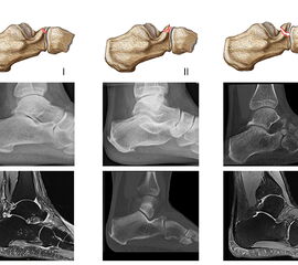Frakturen des Processus anterior calcanei sind in etablierten Kalkaneusfraktur-Klassifikationen (Sanders, Essex-Lopresti, Arbeitsgemeinschaft für Osteosynthesefragen (AO/OTA)) gar nicht oder nur am Rande erwähnt 252627. Diese Klassifikationen subsumieren die Frakturen des PAC unter den extra-artikulären Frakturen. Zwipp und Kollegen führten mit der „Integral Classification of Injuries“ (ICI) eine detaillierte Betrachtung der PAC Frakturen ein. Hier werden diese als artikuläre Verletzungen klassifiziert und zudem begleitende Bandverletzungen und die Fragment-Dislokation berücksichtigt 28. Eine Klassifikation - möglicherweise auf der Basis von CT-Bildern - in die die Fraktur-Lokalisation, die Fragment-Größe und -Dislokation sowie die Begleitverletzungen eingehen, wäre hilfreich, um sich dieser Frakturentität und der damit einhergehenden Behandlungsempfehlung weiter zu nähern. Die von Degan beobachteten extra-artikulären Frakturen im konventionellen Röntgen imponieren in CT und MRT als knöcherne Ausrisse des Lig. bifurcatum im Randbereich des Gelenks. Häufig finden sich aber auch bei kleinen Fragmenten eine intraartikuläre Komponente.