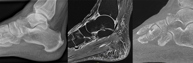 Bei Distorsionen des Sprunggelenks/Fußes stellen konventionelle Röntgenaufnahmen die initiale Standarddiagnostik dar 2021. In Abhängigkeit der Beschwerdelokalisation sollten Röntgenaufnahmen des Sprunggelenks in zwei Ebenen bzw. des Fußes in drei Ebenen angefertigt werden. Frakturen des Processus anterior werden aufgrund von Überlagerungen oder aufgrund von Fehlinterpretation als akzessorischer Knochen (Calcaneus secundarium) nativradiologisch häufig übersehen 3201. Ein zuverlässiger Frakturausschluss sowie die Erfassung von Begleitverletzungen ist nur mittels Schnittbildgebung möglich 22022. Aufgrund der breiten und schnellen Verfügbarkeit ist die Computertomographie (CT) das Verfahren der Wahl 2022. Bei Vorliegen eines plantaren Hämatoms, Hinweisen auf Verletzungen der Chopart-Gelenk-Linie (z. B. talonavikulare Kapselband-Avulsion) oder einer Diskrepanz zwischen der klinischen Untersuchung und der Röntgen-Bildgebung sollte eine CT-Diagnostik veranlasst werden 920197. In der Primärdiagnostik spielt die Magnetresonanztomographie (MRT) eher eine untergeordnete Rolle, da das fokale Knochenödem und das umgebende Weichteilhämatom dazu führen, dass kleinere knöcherne Avulsionen und/oder Bandverletzungen nicht klar differenziert werden können 20.