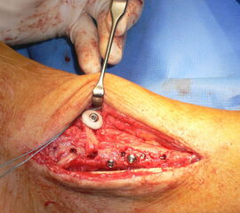 Auch bei Revisionseingriffen an der Syndesmose (z.B. bei Verkalkungen) in Folge einer Verletzung verwenden wir dieses Stabilisationsregime 61. Um Verkalkungen aus der Syndesmose vollständig zu entfernen ist meist eine Durchtrennung der Syndesmosenbänder notwendig, so dass am Ende der Operation die Syndesmose wieder stabilisiert werden muss. Die Nachbehandlung umfasst eine Teilbelastung mit 10 kg, freie Bewegung des Sprunggelenks nach Abheilung der Wunde und die Aufbelastung nach Entfernung der Stellschraube. Werden Verkalkungen aus der Syndesmose entfernt, führen wir eine medikamentöse Ossifikationsprophylaxe durch (analog Hüftendoprothetik)62, im Rezidivfall kann eine zusätzliche Bestrahlung diskutiert werden 6364.