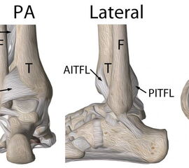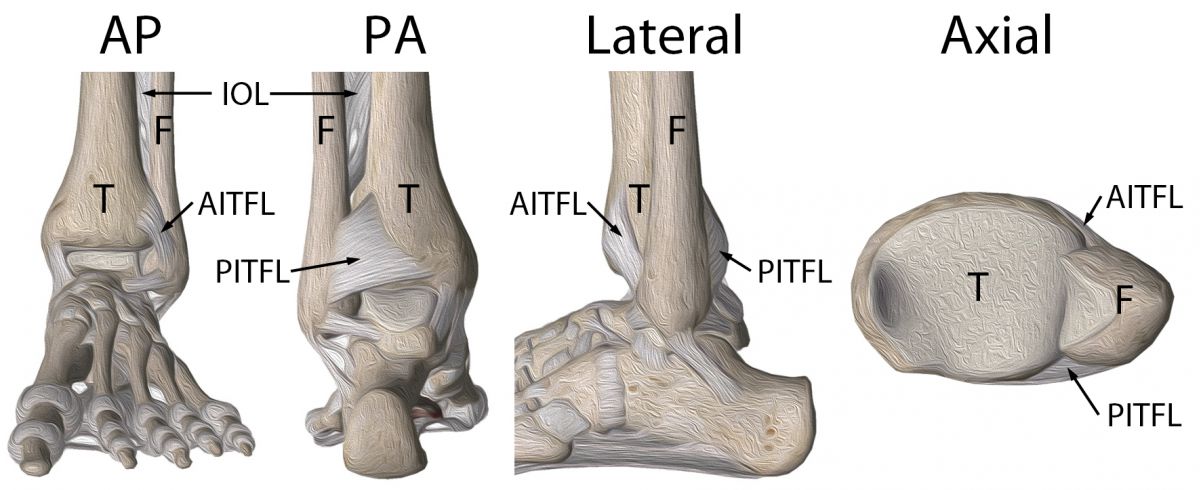 Die Syndesmose wird durch das anteriore (AITFL) und das posteriore tibiofibulare (PITFL) Band, sowie die zentralen, interossären Syndesmosenanteile (ITFL oder IOL) als direkte Verlängerung der Membrana interossea, gebildet 9 (Abbildung 1). Das PITFL setzt sich aus einem tiefen (TTFL) und oberflächlichen Blatt zusammen. Das AITFL und das tiefe PITFL machen zusammen ca. 70% der Stabilität im DTFG aus 10 . In diversen Studien wurde aufgezeigt, dass eine Verletzung von 2 dieser 4 beschriebenen Bandstrukturen zu einer eheblichen Instabilität im oberen Sprunggelenk führt 1011.