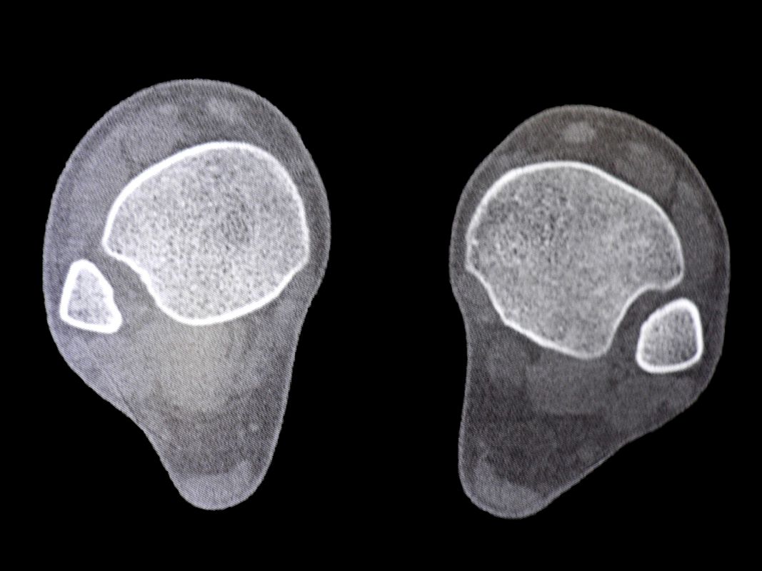 Die CT-Diagnostik erlaubt eine kritischere Beurteilung des DTFG. Die Wertigkeit zur Beurteilung von Syndesmosenverletzungen wurde in diversen Studien untersucht. Die Kongruenz im distalen Tibiofibulargelenk sollte in den axialen Schichten beurteilt werden 39. Aufgrund der hohen physiologischen Varianz, ist ein Seitenvergleich empfehlenswert (Abb. 5). So können die anteroposteriore Translation, Rotation und Verkürzung des betroffenen DTFG im Vergleich zum gesunden DTFG verglichen werden 40.