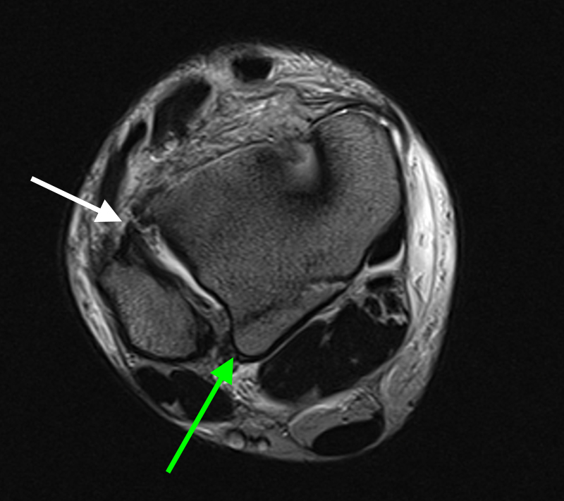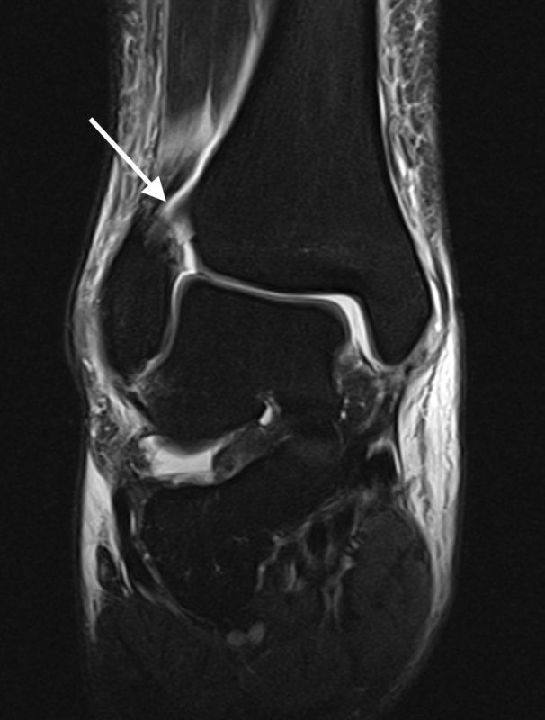 Die Magnetresonanztomographie stellt aktuell den Goldstandard in der Diagnostik von Syndesmosenverletzungen dar (Szeimies 2013). Beschrieben sind eine Sensitivität von 100% und eine Spezifität von 93% bei Verletzungen des AITFL, sowie eine Sensitivität und Spezifität von 100% bei Verletzungen des PITFL. Darüber hinaus ermöglicht das MRT weitere ligamentäre, chondrale oder intraossäre Verletzungen zu detektieren. Bei chronischen Syndesmosenverletzungen sollte eine MRT-Diagnostik mit Kontrastmittel (KM) intravenös durchgeführt werden, da diese eine höhere Spezifität und Sensitivität im Vergleich zur nativen MRT-Bildgebung aufweist. Durch die zusätzliche Gabe von KM können durch eine Mehranreicherung des KM im Bereich der Syndesmose Rückschlüsse auf das Vorhandensein einer chronische Instabilität gezogen werden 41.