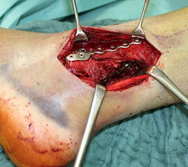 Dislozierte, verrotierte oder instabile AO 44-A Frakturen können über einen geschwungenen lateralen Zugang über die Fibulaspitze entweder mittels Zuggurtungs-, Schrauben- oder Plattenosteosynthese versorgt werden. Handelt es sich um ein sehr kleines distales Fragment, ist die Verwendung einer Hakenplatte häufig hilfreich.