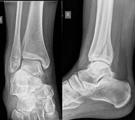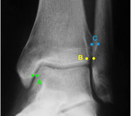 Die Standard-Röntgenaufnahmen des oberen Sprunggelenks bestehen aus drei Aufnahmen: der antero-posterioren Aufnahme (ap), der antero-posterioren Aufnahme mit Innenrotation des Unterschenkels von 20° („Mortise view“), sowie der streng seitlichen Aufnahme (siehe S2-Leitlinie Sprunggelenksfraktur). In der Röntgen-Bildgebung sollte neben den klassischen Frakturzeichen die Integrität der Syndesmose beurteilt werden. Dies erfolgt über die Beurteilung der Breite des lateralen und medialen Gelenkspalts („medial clear space“), des tibiofibularen Abstands 1cm oberhalb des OSG-Gelenkspalts („tibiofibular clear space“), bzw. der tibiofibularen Überlappung. Eine Verbreiterung des tibiofibularen Abstands über 5 mm oder die Erweiterung des medialen Gelenkspalts können Zeichen einer begleitenden Syndesmosenverletzung sein. (Abbildung 3) 6.