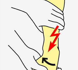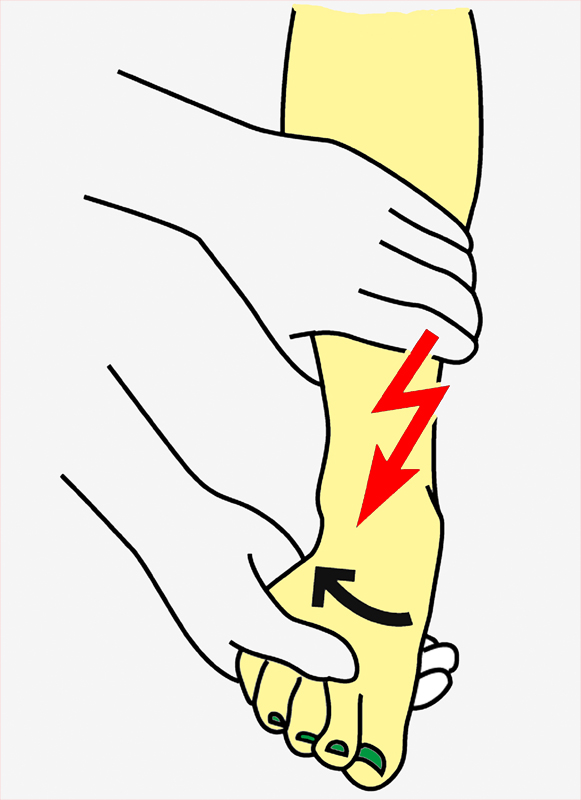 Die klinische Untersuchung nimmt einen hohen Stellenwert ein. Um zuverlässig zwischen einer Distorsion und einer Fraktur zu differenzieren, d.h., um zu entscheiden, ob eine Röntgen-Untersuchung des Sprunggelenkes notwendig ist, kann die „Ottawa Ankle Rule“ angewendet werden. Dabei erfolgt die Untersuchung definierter Druckpunkte (Abbildung 1). Ist einer dieser Punkte druckschmerzhaft oder die Gehfähigkeit > 4 Schritte eingeschränkt, ist eine Röntgendiagnostik zum Ausschluss einer Fraktur indiziert. Das Risiko, eine Fraktur unter Anwendung dieser Regel zu übersehen, liegt bei lediglich 0,4% 34. Auch die klinische Testung der Syndesmose (Syndesmosenschmerz und Schmerzen bei Außenrotation – (Abbildung 2) hat eine hohe Sensitivität für Frakturen und Syndesmosenverletzungen 5 (Level 2b Empfehlung der aktuellen S2-Leitlinie zur Sprunggelenksfraktur).