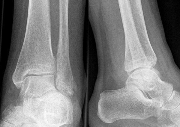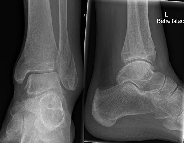Grundsätzlich können isolierte, nicht dislozierte Außen- und Innenknöchelfrakturen ohne Instabilität der Malleolen-Gabel konservativ behandelt werden. Entscheidend ist deshalb, zunächst sicherzustellen, dass keine begleitenden knöchernen oder ligamentären Syndesmoseninstabilitäten (z. B. posteriore Malleolus-Frakturen) oder Verletzungen der medialen Säule (Lig. deltoideum) vorliegen. Da hier die klinischen Zeichen (Schwellung/Schmerzen/Hämatom) nicht immer eindeutig sind, sollte im Zweifelsfall die Stabilitätsprüfung unter Bildwandler-Kontrolle mittels Stresstestung erfolgen 11. Der Außenrotationtest nach Frick bietet hier eine zuverlässige Methode 12. Die Erweiterung des „medialen clear space“ (MCS) gegenüber dem oberen Gelenkspalt von >1 mm bzw. eine totale Weite des MCS von ≥4 mm gelten als Maß für das Vorliegen einer Instabilität der Knöchelgabel 1112.