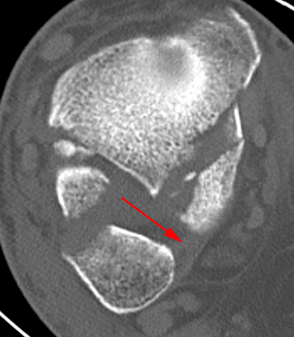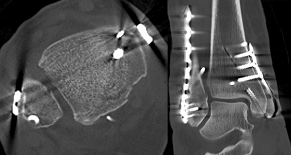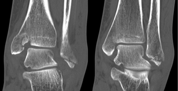 Liegt eine Fraktur des oberen Sprunggelenks vor, ist sowohl zur Entscheidung für ein konservatives oder operatives Vorgehen, als auch zur Operationsplanung, ein ausreichendes Verständnis der Fraktur und ihrer Morphologie notwendig. Insbesondere bei komplexen Verletzungen ist dafür die konventionelle Röntgenaufnahme in vielen Fällen nicht ausreichend. So konnten z.B. Black et al. zeigen, dass die operative Strategie zur Versorgung von OSG-Frakturen in 24% basierend auf einer zusätzlichen CT-Bildgebung relevant geändert wurden 7. Dies betraf die Lagerung, die Wahl des Zuganges und die Art der osteosynthetischen Versorgung. Besonders häufig änderte sich das Vorgehen bei Verletzungen des medialen (21%) und des posterioren Malleolus (15%). Darüber hinaus führten dislozierte (dislozierte Frakturen 31% vs. nicht-dislozierte Frakturen 20%) oder komplexe Frakturen (Trimalleolar-Frakturen 29% vs. Unimalleolar-Frakturen 10%) besonders häufig zu relevanten Änderungen des operativen Vorgehens. Die Computertomographie ist daher, insbesondere bei Bi- und Trimalleolar-Frakturen, essentiell für das Verständnis der Fraktur und somit für die Planung und Durchführung der Operation. In Abbildung 4 und 5 sind exemplarisch ein Röntgen- und ein CT Befund gegenübergestellt.