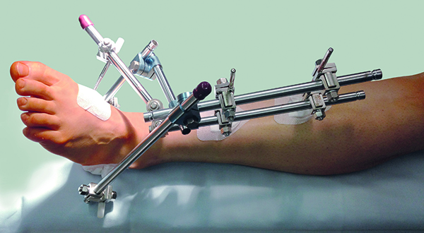 Luxationsfrakturen (Abbildung 7) sollten unter i.v.-Analgesie so schnell wie möglich reponiert werden, um Haut- und Weichteilschäden, Störungen der Durchblutung und Sensibilität, sowie den durch die Fehlstellung bedingten Druck auf den Knorpel zu verringern. Anschließend erfolgt die Ruhigstellung in einem gespaltenen Unterschenkelgips. Offene Frakturen, geschlossene Frakturen mit kritischen Weichteilverhältnissen, sowie hochgradig instabile Frakturen, die sich unter entsprechender Analgesie nicht zufriedenstellend reponieren bzw. retinieren lassen, stellen eine Notfallindikation dar. In diesen Fällen sollte die Anlage eines Fixateur externe erfolgen (Abbildung 8). Die definitive Frakturversorgung erfolgt zweizeitig nach entsprechender Konsolidierung der Weichteile. Eine Kompartment-Spaltung ist bei OSG-Frakturen nur sehr selten erforderlich.