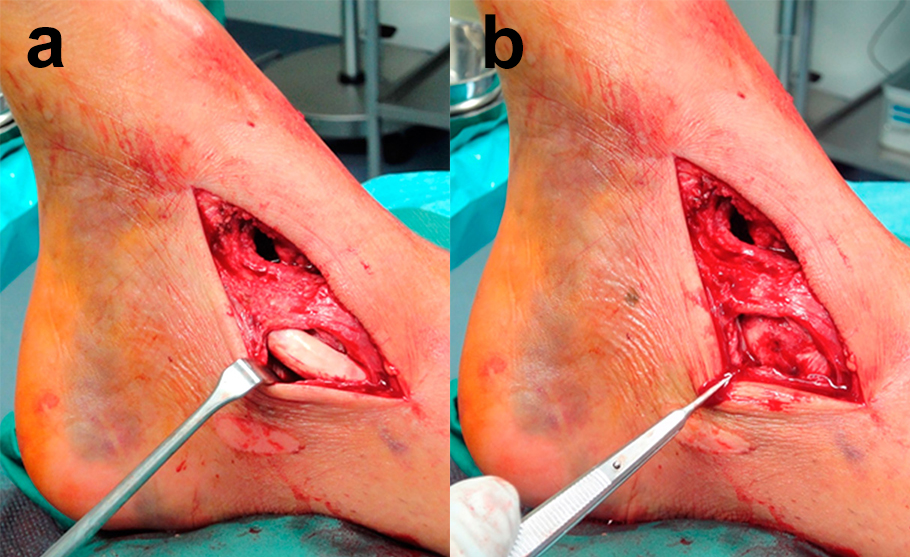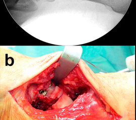 Wenig Aufmerksamkeit wurde in der Literatur bislang den Impressionsfrakturen der medialen Gelenkfacette gewidmet. Wird diese jedoch nicht reponiert, droht ein chronisches Einsinken derselben mit nachfolgender Varusabweichung des Rückfußes 30. Diese Impressionen werden über einen tief angelegten medialen Zugang etwas oberhalb des tastbaren Sustentaculum tali dargestellt und angehoben (Zwipp, Rammelt 2014). Hierbei dient die mediale Facette des Calcaneus als Schablone. Zur Unterfütterung der Defekte kann autologe Spongiosa von der distalen Tibiametaphyse oder dem Calcaneus gewonnen werden (Abb. 18). Die Stabilisierung erfolgt vorzugsweise mit kleinen, winkelstabilen Platten 30.