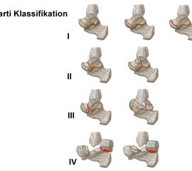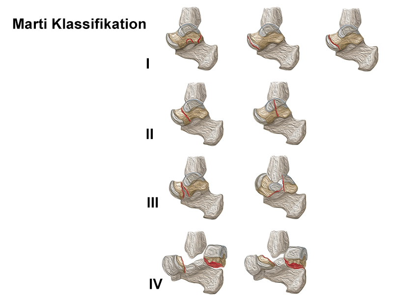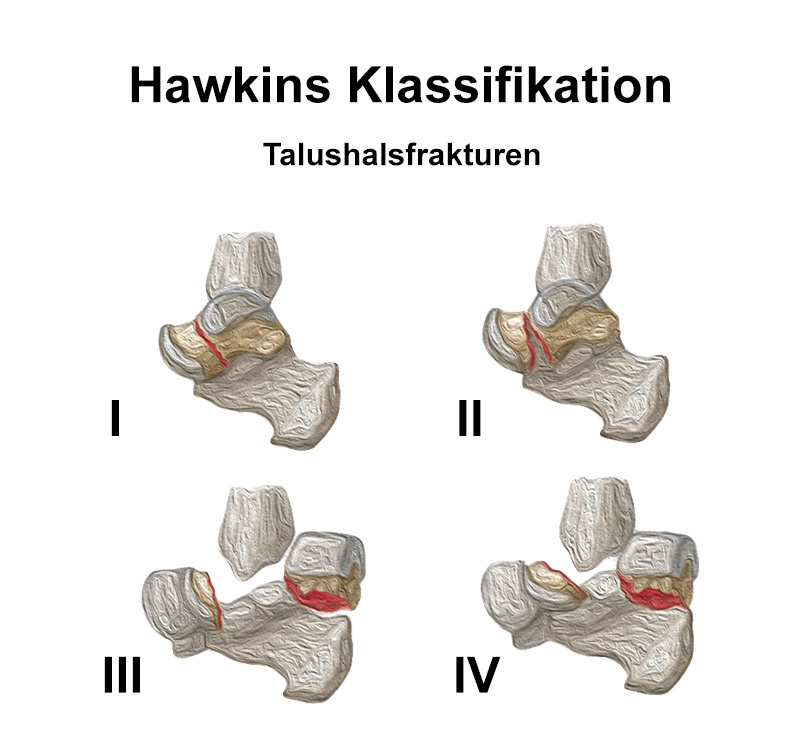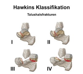Bei der Klassifikation nach Hawkins 17, die die häufigen Talushalsfrakturen beschreibt sowie bei der im deutschen Sprachraum gebräuchlichen Klassifikation nach Marti (Marti 1978) für alle zentralen und peripheren Talusfrakturen besteht ein direkter Zusammenhang zwischen dem Dislokationsgrad und dem Risiko einer avaskulären Nekrose. Die Einteilung nach Hawkins 17, die ursprünglich 3 Typen unterschied, wurde später von Canale und Kelly 18 um einen Typ IV ergänzt.