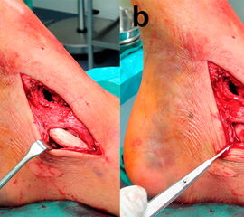 Begleitende Verletzungen, wie osteochondrale Frakturen, Sehnenrupturen oder Luxationen mit Ausriss des Retinaculums werden im Anschluss an die knöcherne Rekonstruktion versorgt (Abb. 7, 8).