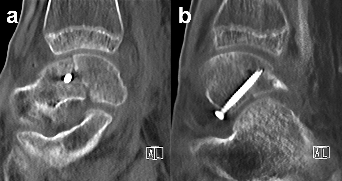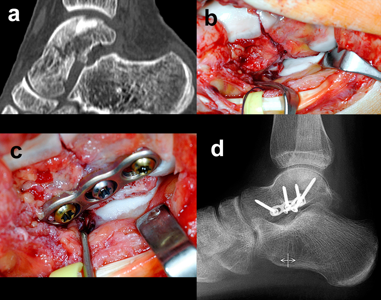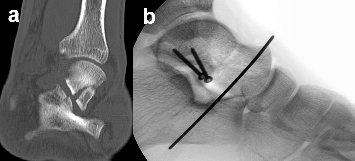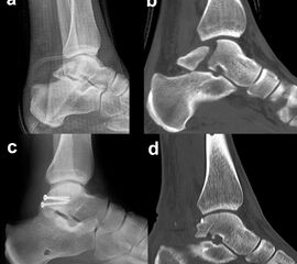 Gelegentlich kann ein externer Distraktor oder ein perkutan eingebrachter Kirschnerdraht als Repositionshilfe dienen (Zwipp, Rammelt 2014) 26. Zur Retention der geschlossenen oder limitiert offenen Reposition und Protektion der Weichteile wird die Fraktur in der Regel mit einem temporären tibiometatarsalen Fixateur extern ruhiggestellt. Gelegentlich sind zusätzlich zur Retention transfixierende gelenküberbrückende Kirschnerdrähte notwendig 5. Die definitive Versorgung sollte dann nach entsprechender Vorbereitung und präoperativer Planung sowie dem Abschwellen der Weichteile unter optimalen Bedingungen von einem erfahrenen Team erfolgen. Erst nach der Grobreposition von Luxationsfrakturen sollte eine CT erfolgen, damit eine sinnvolle Analyse und Planung möglich sind.