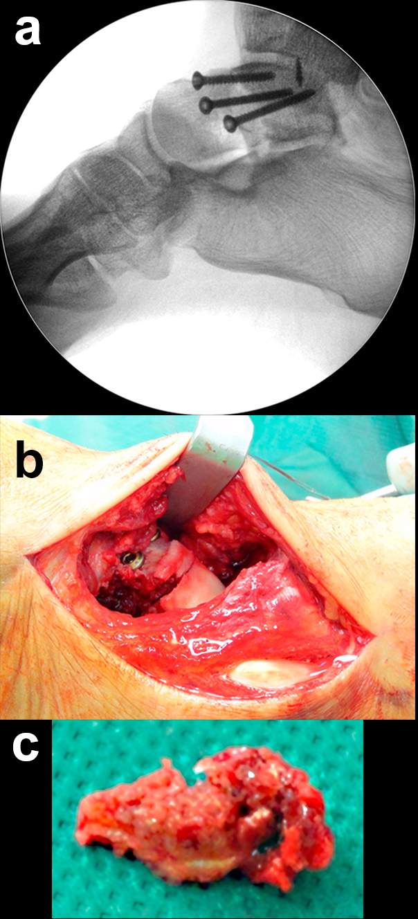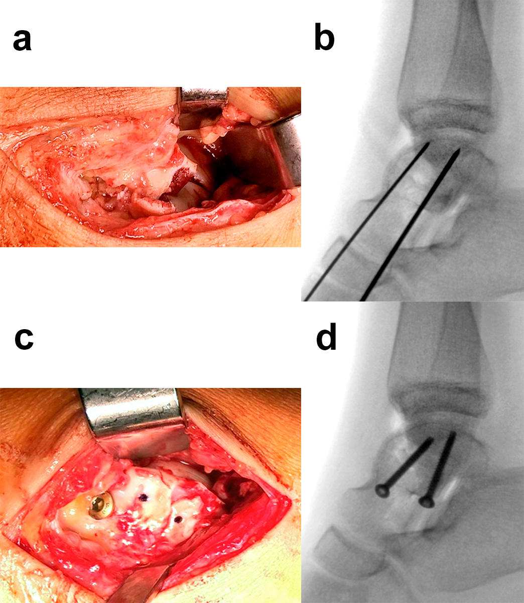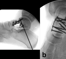 Die Reposition des Talushalses erfolgt unter wechselseitiger Sicht von medial und lateral 24. Zur Manipulation können senkrecht zur Fraktur in die Hauptfragmente eingebrachte Kirschnerdrähte hilfreich sein 4. Nach temporärer Retention mit axial eingebrachten Kirschnerdrähten und visueller sowie Bildwandlerkontrolle werden zur Stabilisierung vorzugsweise Schrauben benutzt (Abb. 6). Müssen diese nahe zum Talonavicular-Gelenk eingebracht werden, sind Doppelgewindeschrauben oder die Verwendung einer Kopfraumfräse zum Versenken des Schraubenkopfes unter Knorpelniveau erforderlich. In jedem Fall sollte bei der Schraubenosteosynthese aufgrund der typischerweise vorliegenden medialen Trümmerzonen auf die Vermeidung von Zugkräften geachtet werden, um eine Verkürzung der medialen Seite des Talus mit nachfolgender Varusfehlstellung zu vermeiden 30. Kleinste, nicht refixierbare Fragmente werden verworfen, um freien Gelenkkörpern vorzubeugen. Auf der lateralen Seite hingegen liegt recht häufig eine einfache Fraktur vor, welche in einem Kortikalis-Sporn am Proc. fibularis tali ausläuft und sich für eine Zugschraubenosteosynthese eignet. Die Verwendung kanülierter Schrauben kann im Einzelfall hilfreich sein. Es ist jedoch darauf zu achten, dass es nach dem Überbohren des Führungsdrahtes nicht zu einer erneuten Dislokation der Fragmente kommt 24.