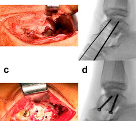 Der Einsatz eines Femurdistraktors, welcher zwischen Tibia und Calcaneus aufgespannt wird, kann zur Übersicht über das obere und untere Sprunggelenk sehr hilfreich sein. Die anatomische Gelenkreposition und temporäre Fixierung erfolgen unter direkter Sicht. Zur Osteosynthese kommen meist Schrauben zum Einsatz (Abb. 14). Auf eine Irritation der Gelenkflächen oder der Flexor-hallucis-longus-Sehne sollte bei Einbringen der vorzugsweise kleinkalibrigen (2,7 – 3,5 mm) Schrauben geachtet werden 4.