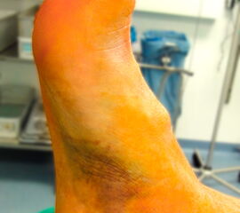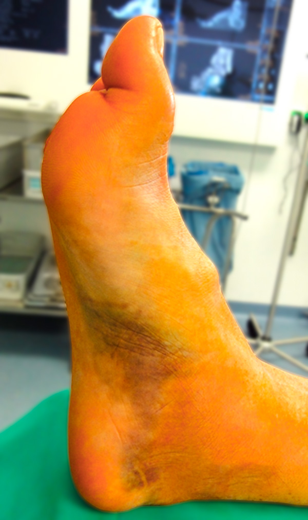 Aufgrund des vulnerablen Weichteilmantels im Bereich des Sprunggelenks weisen dislozierte zentrale Talusfrakturen (Korpus, Hals) häufig Störungen der Hauttrophik auf. Dislokationen sind meist augenfällig (Abb. 2) und die dislozierten Fragmente lassen sich perkutan tasten. Zudem ist meist eine abnorme Fußfehlstellung bei Luxationsmechanismen erkennbar. Hier ist insbesondere bei Fragmentdruck auf die periphere Durchblutung zu achten. Eine initiale Dopplersonografie oder die Indikation zur Kompartmentdruckmessung sollte durchgeführt werden.
