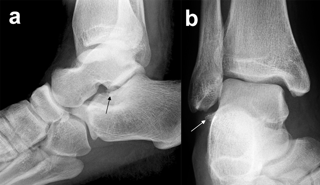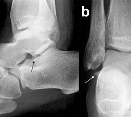 Durch Supinationsverletzungen des oberen Sprunggelenks können Flake fractures - osteochondrale Abscherfrakturen an der Talusrolle entstehen. Diese liegen mehrheitlich (antero-)lateral und müssen von einer Osteochondrosis dissecans, die eher (postero-)medial zu finden ist, und nicht immer eine Traumaanamnese aufweist, abgegrenzt werden (Zwipp, Rammelt 2014).