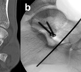 Inwiefern zur Ermöglichung einer frühfunktionellen Nachbehandlung eine Osteosynthese auch bei nicht dislozierten Talushals- und Taluskorpusfrakturen sinnvoll ist, ist nicht gesichert 5. Prinzipiell können in solchen Fällen unter arthroskopischer Kontrolle perkutane oder minimalinvasive Schraubenosteosynthesen Anwendung finden.