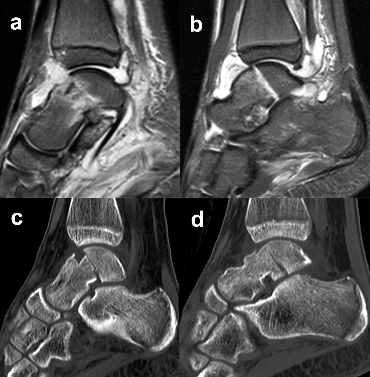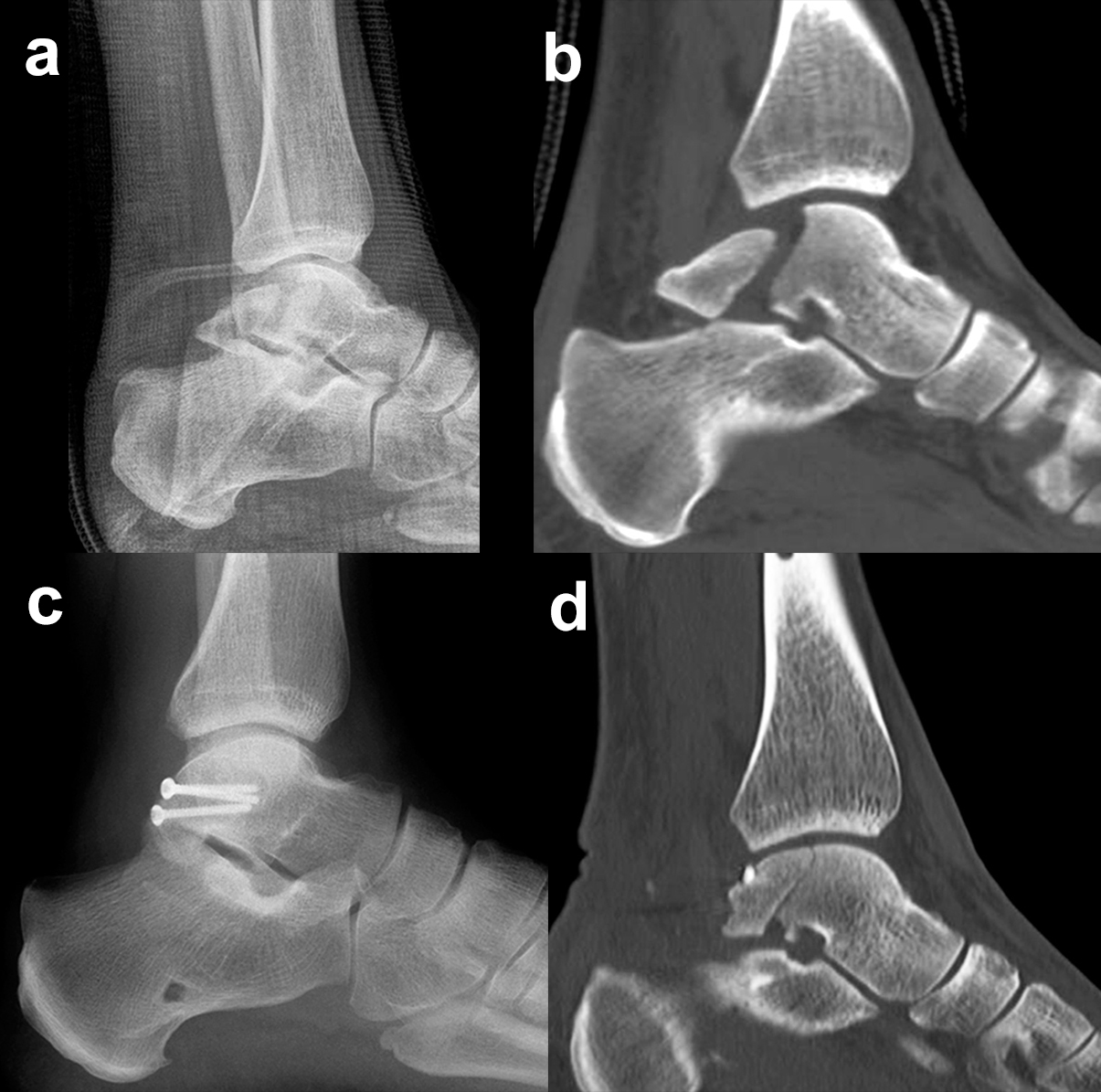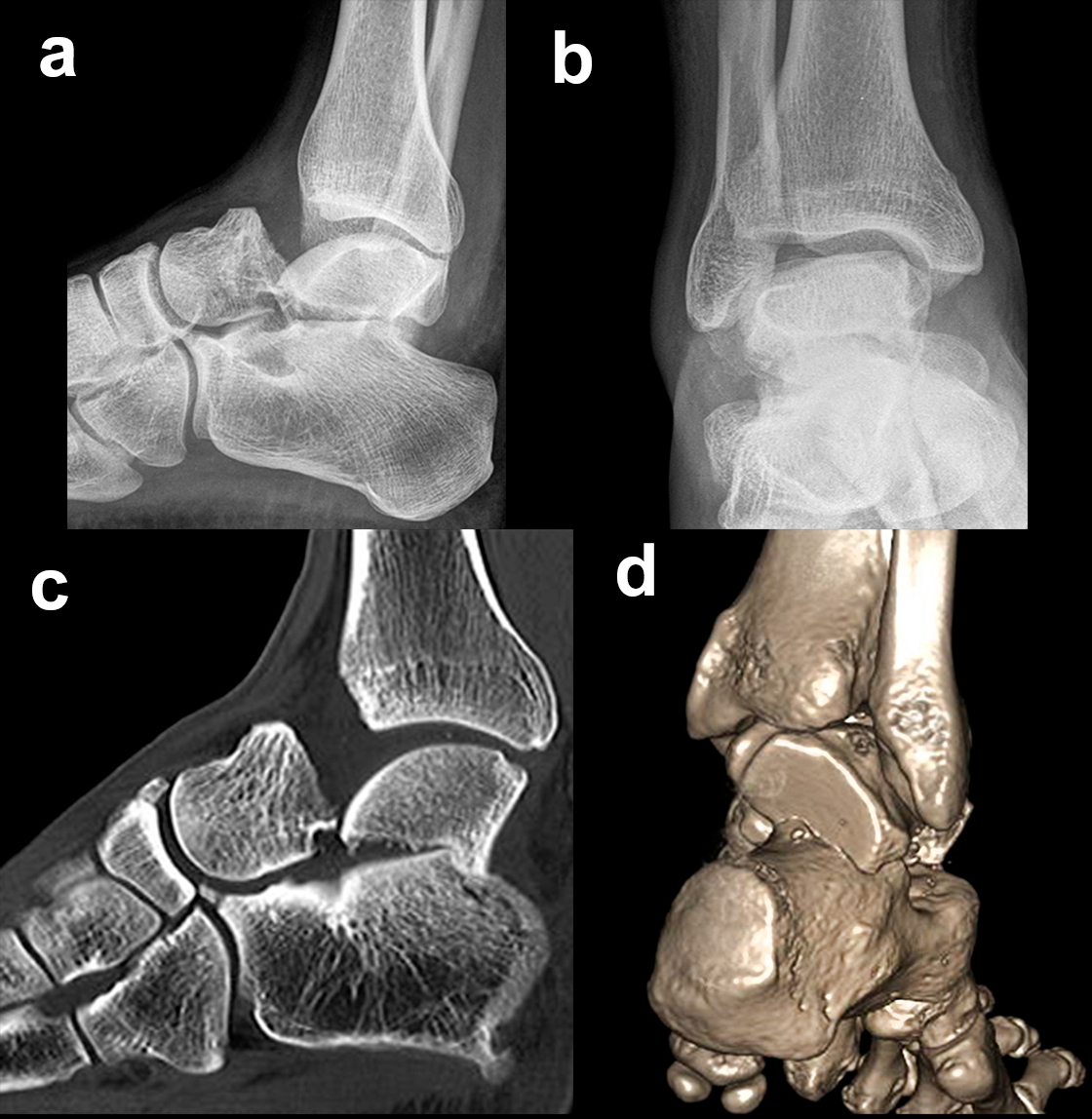 Bei in den konventionellen Aufnahmen nicht sicher auszuschließender Talusfraktur bzw. zur genauen Darstellung der Dislokation bei Taluskorpus- oder Talushalsfraktur sollte die Indikation zur CT-Diagnostik großzügig gestellt werden (Abb. 1 c, d). Insbesondere dient die CT-Diagnostik zur genauen Evaluierung der Frakturmorphologie und OP-Planung sowie auch zur Vermeidung möglicher übersehener peripherer Talusfrakturen 4.