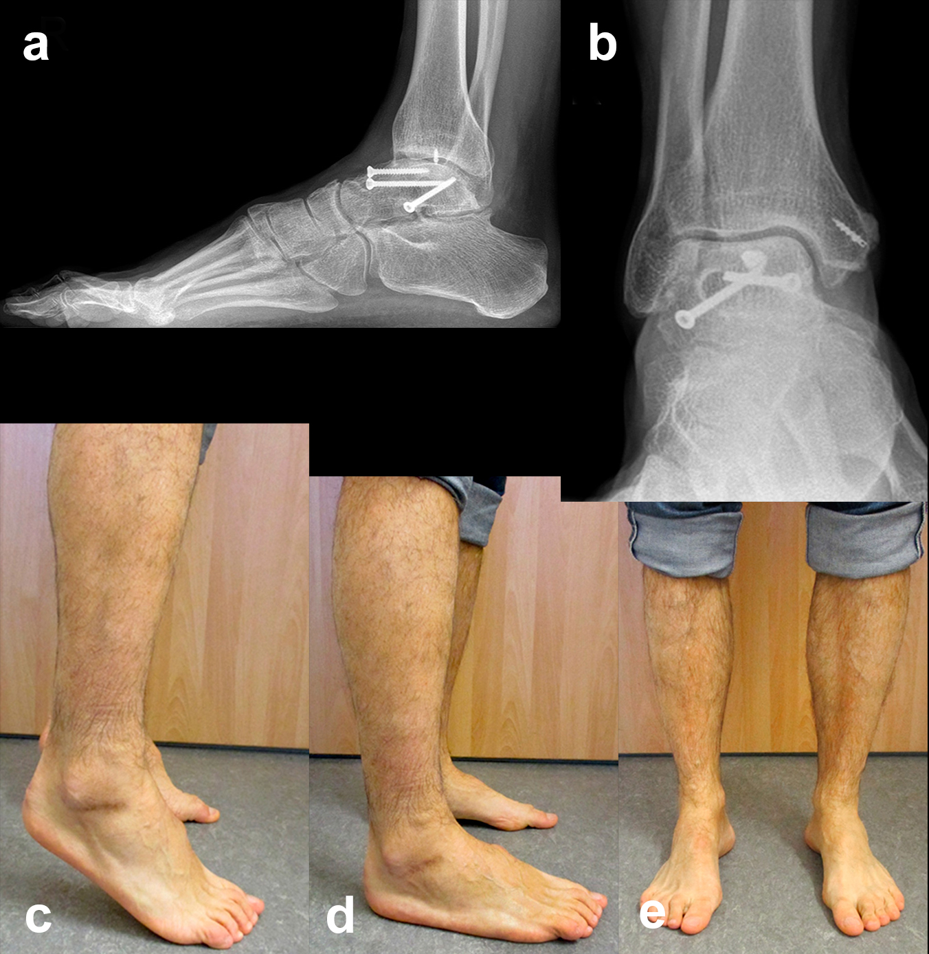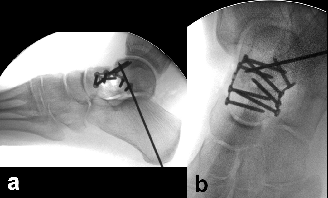 Verbleibt nach der Versorgung aller knöchernen Verletzungen eine ligamentäre Instabilität, so ist zur sicheren Bandheilung und damit auch Protektion der Osteosynthese eine temporäre Gelenktransfixierung für 6 Wochen indiziert 5. Dies betrifft nach der Versorgung von Talushals- und –korpusfrakturen eher das Subtalar-Gelenk (Abb. 10), nach Taluskopffrakturen eher das Chopart-Gelenk 12.