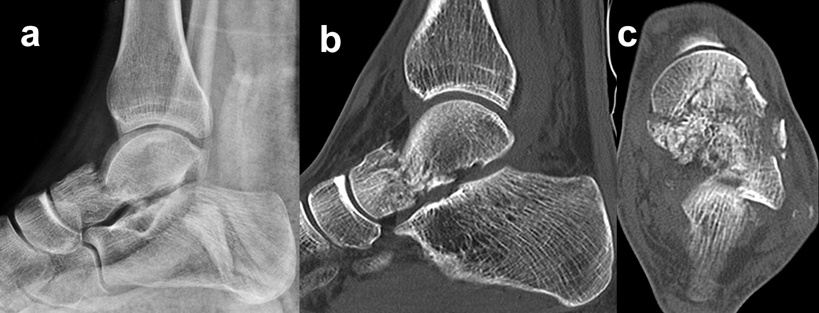 Frakturen des Processus posterior tali sind ebenfalls oft Ausdruck einer subtalaren Luxation und entstehen oft auf den plantarflektierten Fuß durch Kompression zwischen Tibiahinterkante und Tuber calcanei 10 und sollten von einem separaten Os trigonum oder dem seltenen Talus bipartitus unterschieden werden 11.