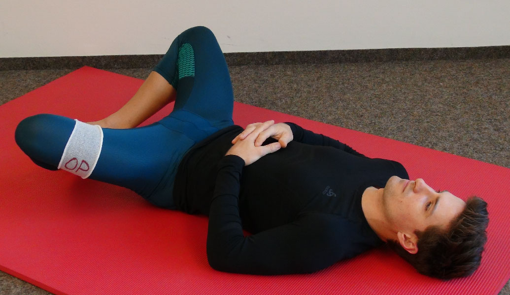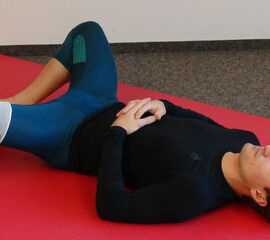 Beide Knie werden nach außen Richtung Unterlage geführt, ohne dass sich das Becken anhebt, die Fußinnenkanten berühren sich weiterhin.