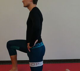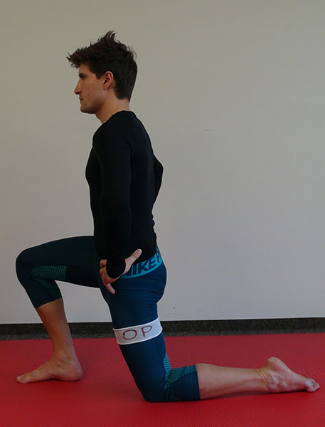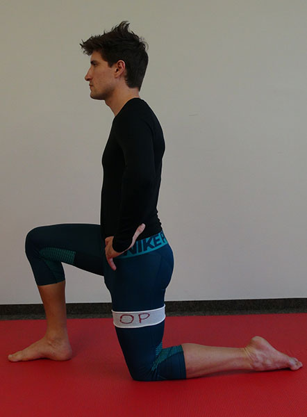 Das Knie des operierten Beins wird in den Boden geschoben, der Kopf (nicht das Kinn!) wird Richtung Decke orientiert. Das Becken wird aufgerichtet nach vorne geschoben, dabei nicht ins Hohlkreuz fallen (Bauchspannung halten).