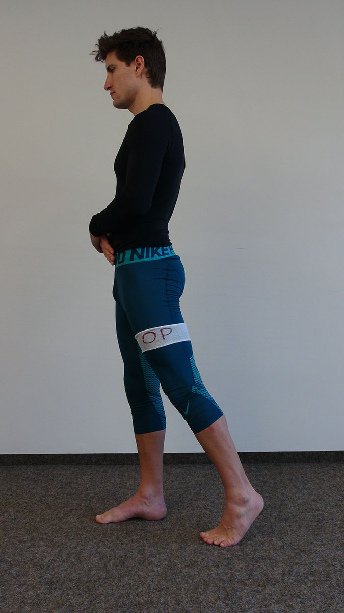 Stand mit leichter Schrittstellung, etwa 80% des Körpergewichts sind auf dem vorderen nicht operierten Bein. Das hintere operierte Bein steht nur mit den Zehenspitzen auf dem Boden.