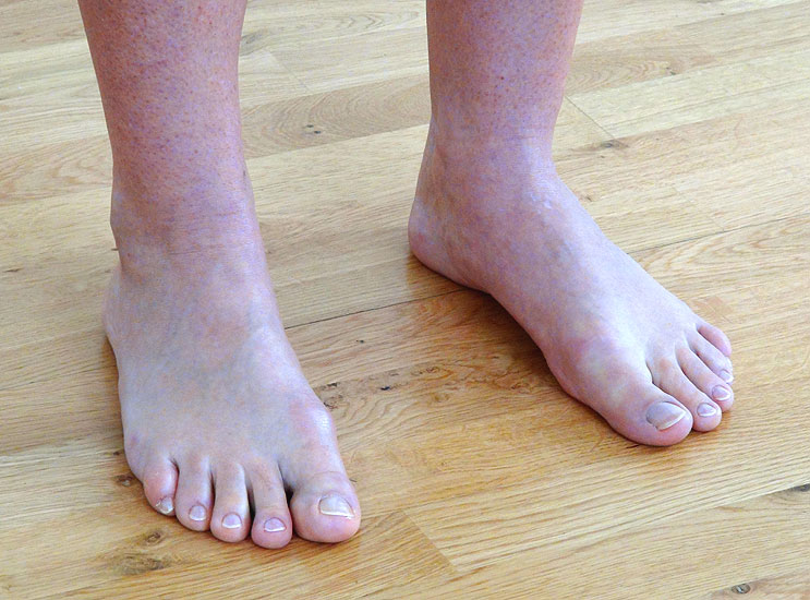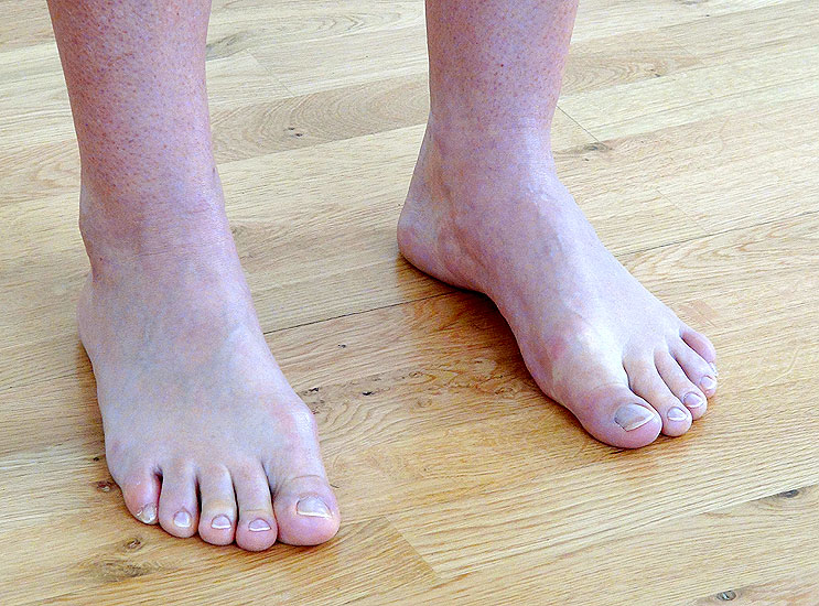 Stehen Sie mit der Vorstellung, den Kopf zur Decke zu schieben und die Fersen in den Boden zu schieben. Jetzt beide Großzehenballen aktiv über Muskelkraft (siehe Übung II) gegen den Boden schieben und die Fersen aktiv aufrichten.