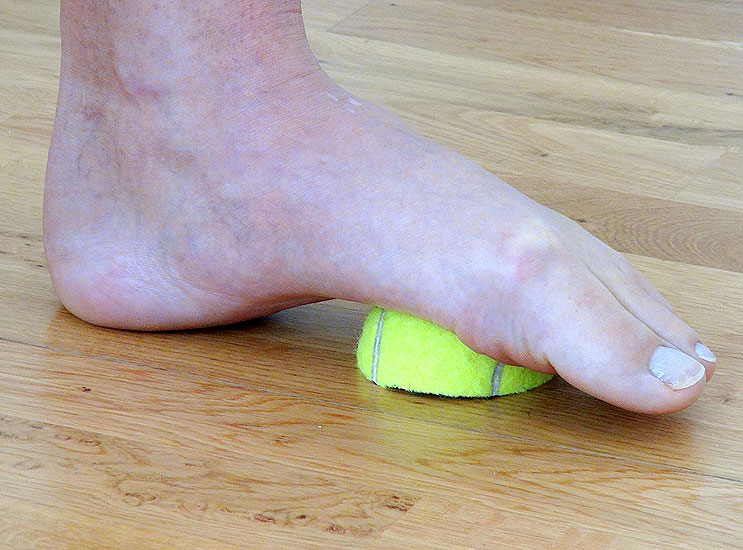 Die Übung kann auch im Sitzen gemacht werden. Wenn Sie keinen halben Tennisball zur Verfügung haben, können Sie das auch mit einer zusammengerollten Socken oder etwas Ähnlichem machen. In Schuhen, z.B. am Schreibtisch kann die Vorstellung auch sein, die Mitte des Vorfußes von der Sohle zu lösen ohne die Zehen in den Schuh nach unten zu pressen.