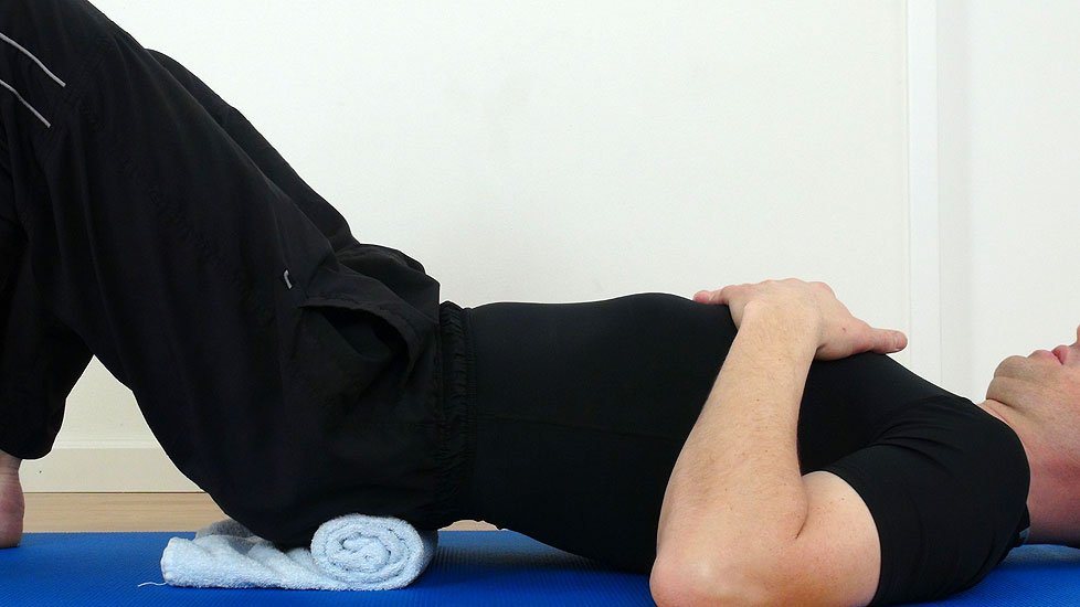 Ausgangsstellung: Rückenlage, beide Beine angestellt, feste Handtuchrolle unter dem Kreuzbein positioniert.