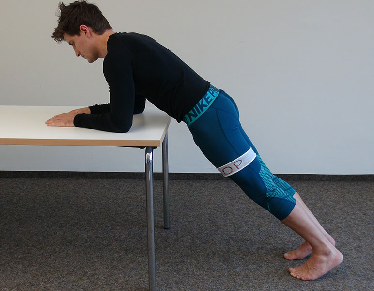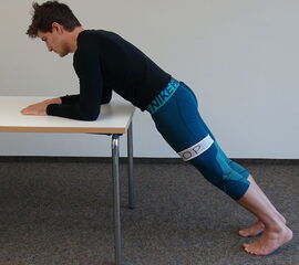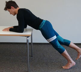 Unterarmstütz auf einem Tisch, die Wirbelsäule ist gerade und bildet mit den Beinen eine Linie.
