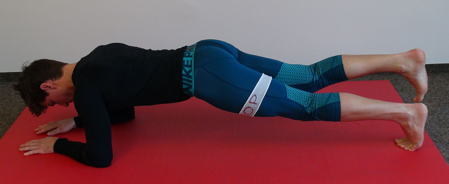 Im Wechsel wird jeweils ein Fuß etwa 5 cm vom Boden abgehoben, ohne dabei ins Hohlkreuz bzw. Rundrücken zu fallen. Position für 3 Sekunden halten, anschließend Seite wechseln.