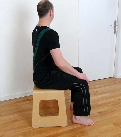 Ausgangsstellung: Sitz auf Stuhl, Gummiband um Schultergelenk hinten rüber zum gegenüberliegenden Becken gespannt.